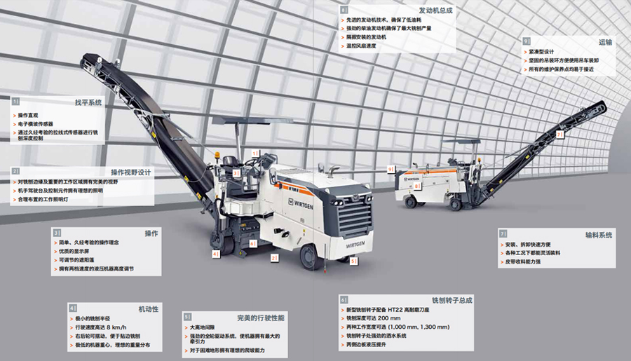 A:極小的銑刨半徑,行駛速度高達8km/h,右后輪可擺動,狹窄區(qū)域施工時便于貼邊銑刨。